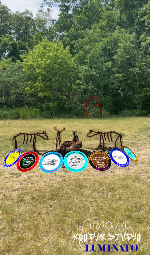 Limited//Limitless (2023) is a part-physical, part-AR installation by Quinn Hopkins displayed on the ice of Lake Nipissing for Ice Follies. Physical artwork marks the frozen surface, while viewers use QR-activated AR on their phones to reveal a hidden digital ecosystem beneath. The piece reflects on the relationship between Anishinaabe people and fish, especially walleye, as food, spirit, and medicine. By infinitely mirroring a pickerel within a translucent box, it suggests abundance but also warns of delicate balance and the need for stewardship.
